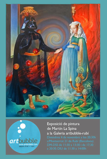 Clacisismo y Modernidad Los cuadros de Martín La Spina sorprenden por el hoy inusual dominio del dibujo, por la visión nueva de los clásicos renacentistas y por su sentido estético cercano al modernismo con la aplicación de la línea curva "latiguillo" o "coup de fouet" y la representación de figuras alegóricas de raíz simbolista, al más puro estilo de la decoración modernista catalana que Martín conoce a la perfección. Martín La Spina nos devuelve a un pasado que todos conocemos, entendemos y admiramos, pero nos lo entrega de una forma adecuada a nuestro tiempo, filtrada por la influencia de Gustav Moreau, del romanticismo de Friedrich y del surrealismo daliniano, de Magritte, Delvaux y aún más claramente de Pierre Roy y también por toda la cultura de masas con su infinita iconografía, del cine a los comics, del pop al realismo fantástico, de las artes decorativas a la ilustración. Martín La Spina es un joven pintor que vive la cultura mosaico de nuestra sociedad de la información y la plasma con su formación académica y su cultura ortodoxa, sin deformaciones, con respeto, pero con la mirada joven y actual que le permite abordar cualquier motivo sin complejos, eliminando la trascendencia en aras del efecto decorativo y de la invención surrealista. Al igual que Jean Auguste Dominique Ingres, cuyo neoclacisismo recrea en ocasiones, cree que un buen cuadro es un buen dibujo bien coloreado, pero además cree que el arte pictórico tiene al tiempo una función historial, una base narrativa. La pintura describe, representa, narra, sugiere cosas...