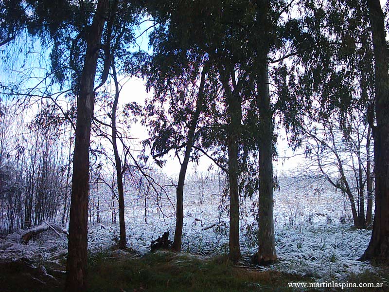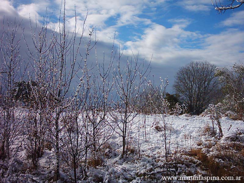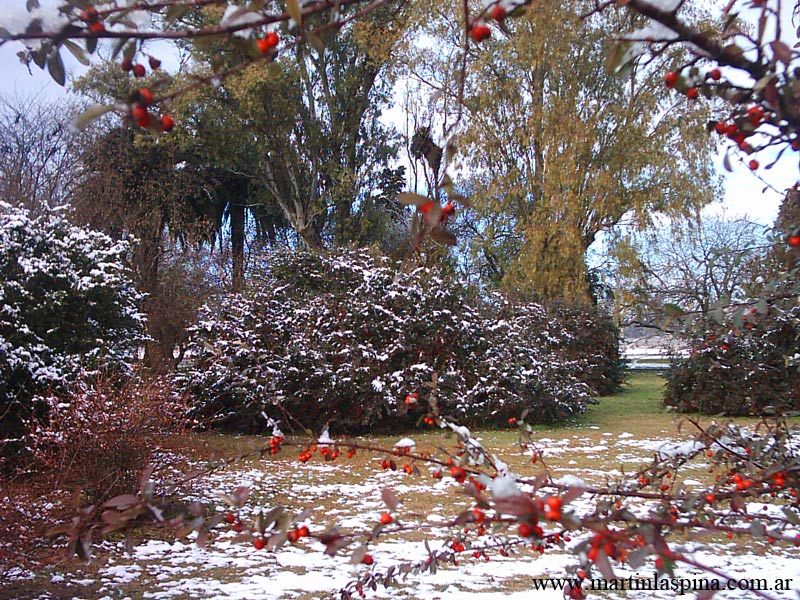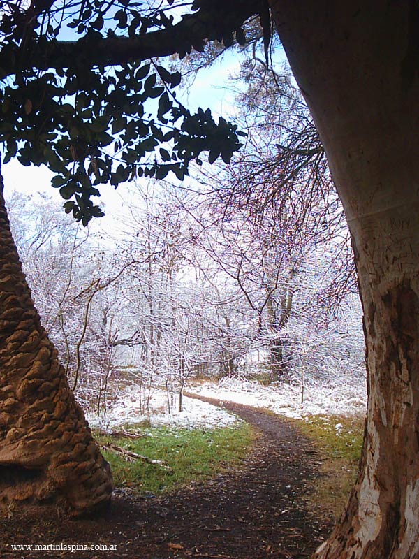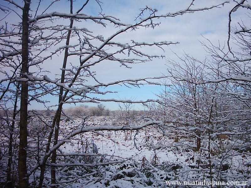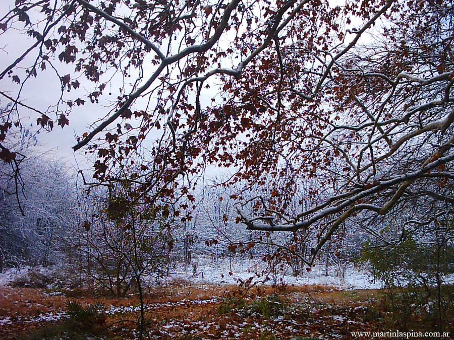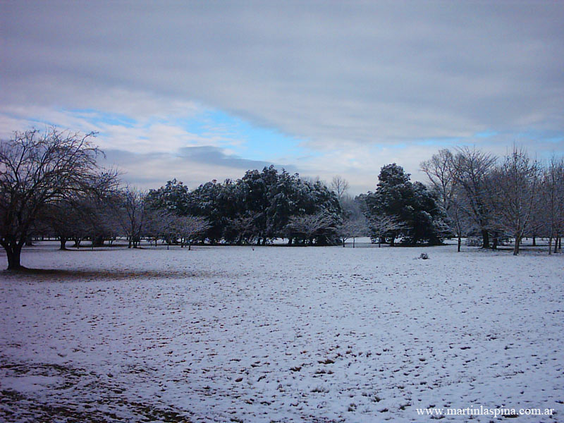 Durante la tarde y noche del 9 de Julio de 2007 nevó copiosamente en toda esta zona de la Provincia de Buenos: un fenómeno issólito ¿alarmante?. El blanco manto permaneció por algunas horas, al mediodía del día 10 ya había desaparecido. Estas son las fotografías que he tomado en el Parque Ecológico, en mi pueblo de Villa Elisa. |
